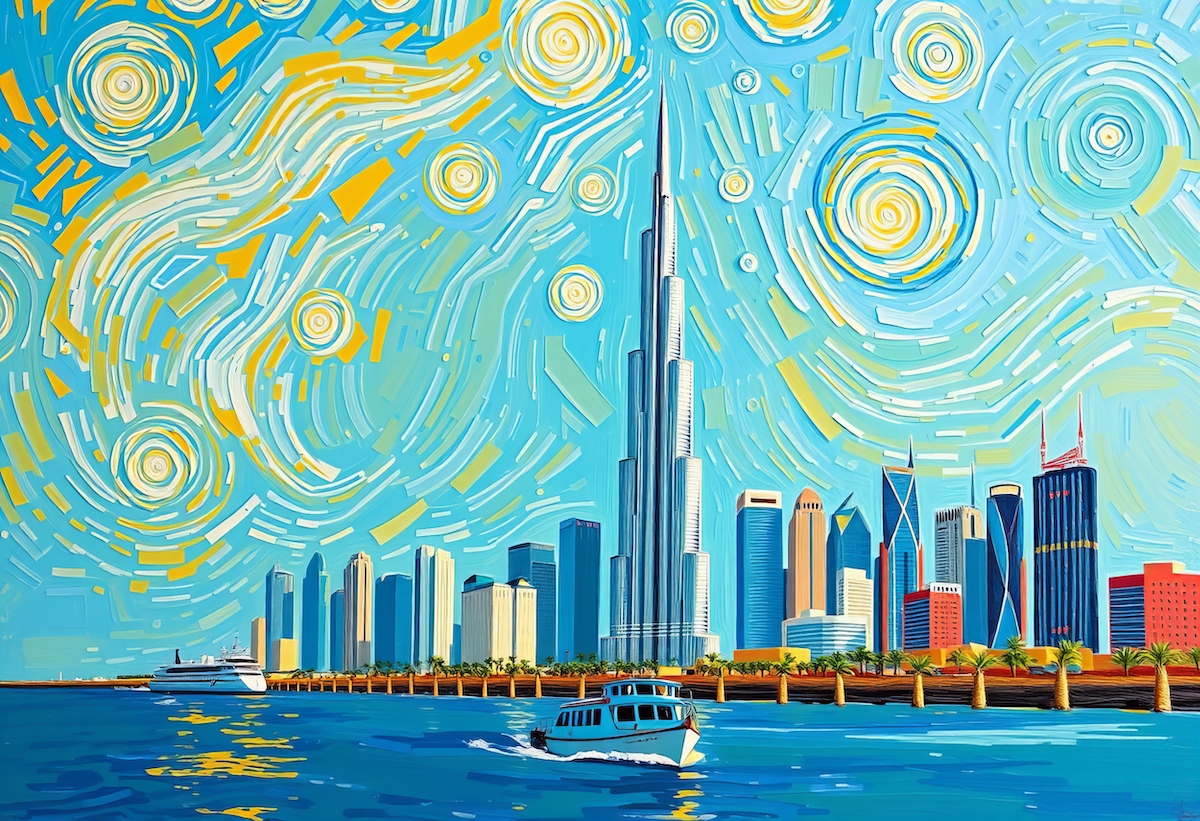 Himlen lever i van Goghs spiraler, vandet spejler guld og blå, skylinen med det majestætiske Burj Khalifa står kraftfuldt i centrum. Et øjeblik fuld af lys og bevægelse, fanget i van Goghs stil.