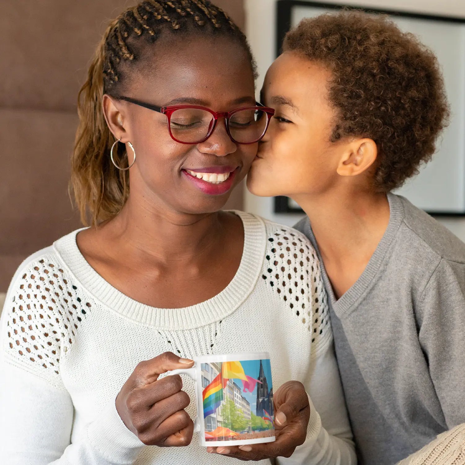 Dette kunstkrus viser Kölner Dom, som du måske aldrig har set det før: omgivet af regnbueflag, der blafrer i vinden. Det er Pride i Köln – byen fejrer mangfoldighed, kærlighed og synlighed. De farverige flag foran domkirkens grå tårne, den blå himmel over – et billede, der giver mod og viser stolthed.