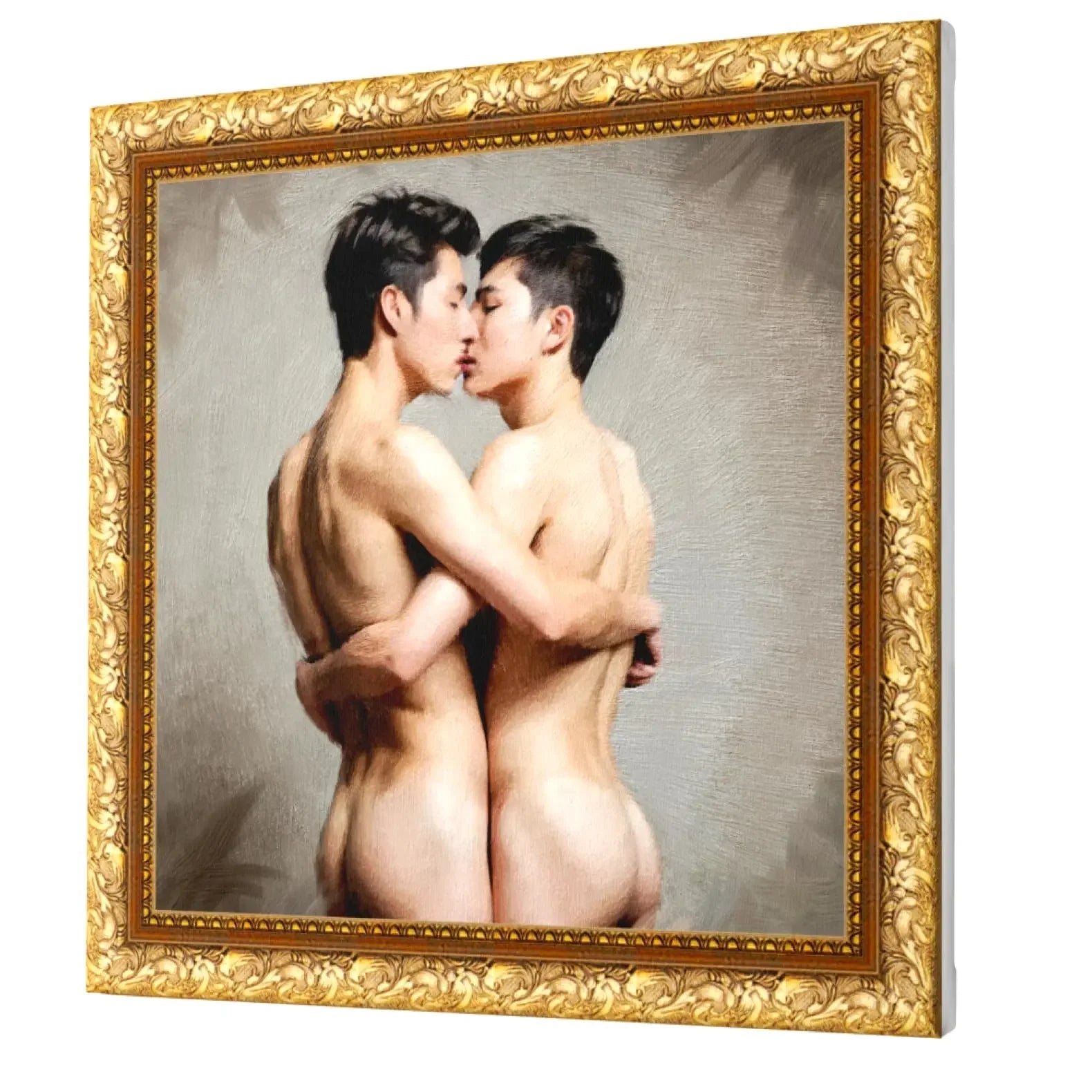 Intim nærhed i varme farver – dette rørende lærredsvægmaleri viser to unge mænd i en inderlig omfavnelse, afbildet i klassisk oliemaleri-stil med et varmt guldramme-motiv.