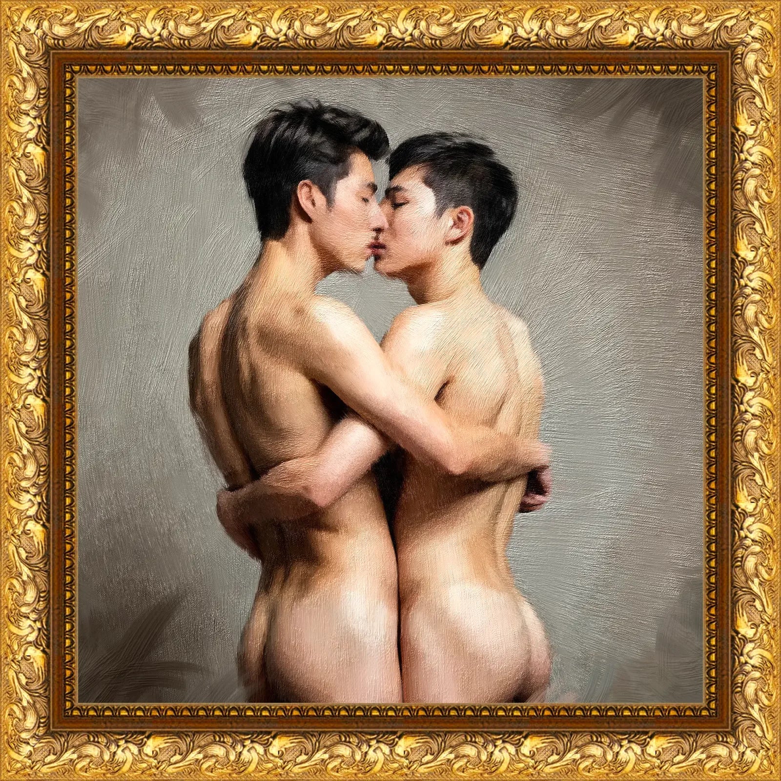 - Klassisk oliemaleri-stil: Tidløs kunstnerisk fremstilling af homoseksuel kærlighed
