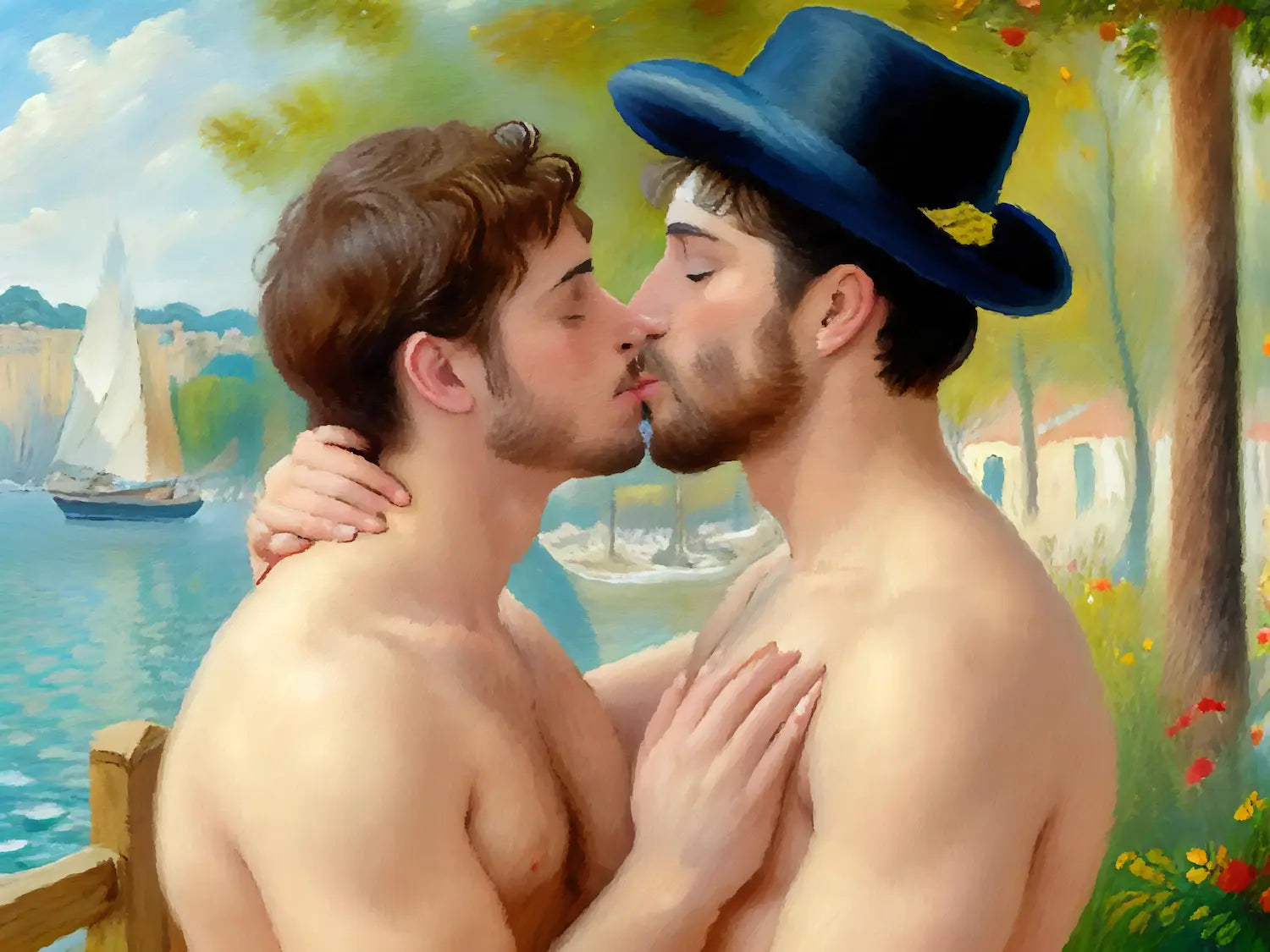 Zwei junge Männer, nackt und verliebt, am sonnendurchfluteten Ufer. Einer trägt einen blauen Hut, der andere hält ihn zärtlich im Arm. Ihre Lippen berühren sich – ein Moment voller Intimität und Sehnsucht, festgehalten in leuchtenden impressionistischen Farben.
