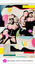 Die Farbflächen – Neongelb dominiert, dazu Pink, Rot, Grün, Blau, Schwarz – sind nicht nur Rahmen. Sie sind eigenständige Elemente der Komposition, schaffen Räume, setzen Akzente. Rechts unten: nur Farbe, keine Figur. Die Collage atmet.