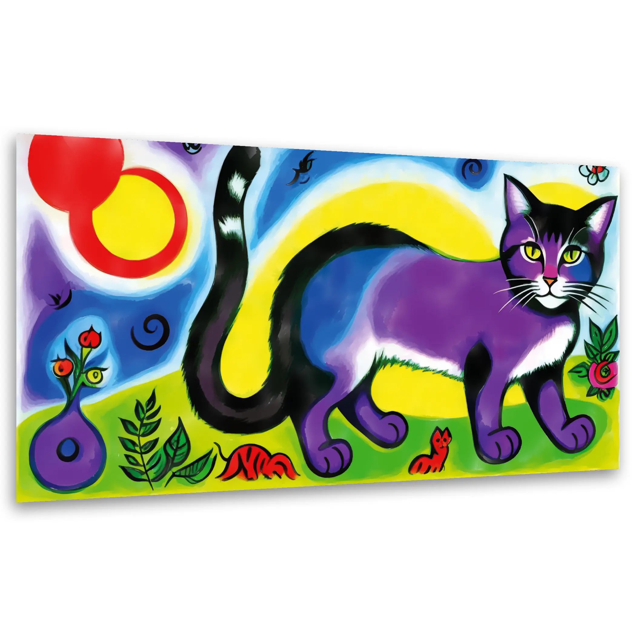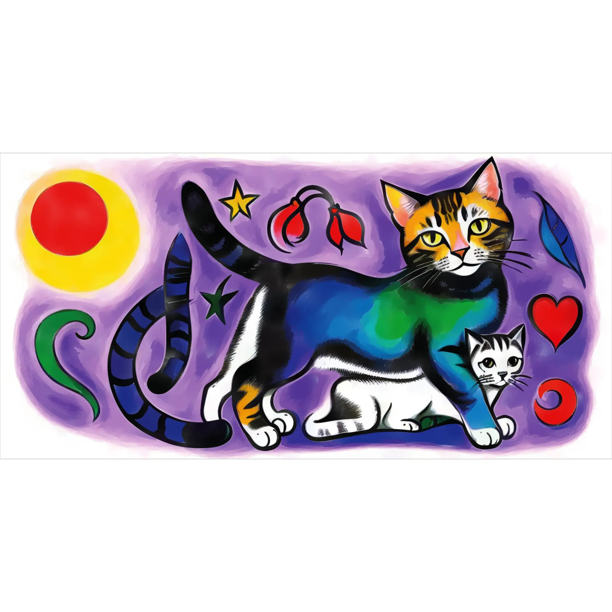 Eine große Katze mit blau-grünem Körper und gestreiftem Schwanz. Eine kleine schwarz-weiße Katze daneben. Über ihnen eine gelb-rote Sonne, Sterne, eine rote Blume, ein Herz, ein blaues Blatt. Der Hintergrund leuchtet in Lila. Nichts davon folgt Regeln - alles folgt Fantasie.