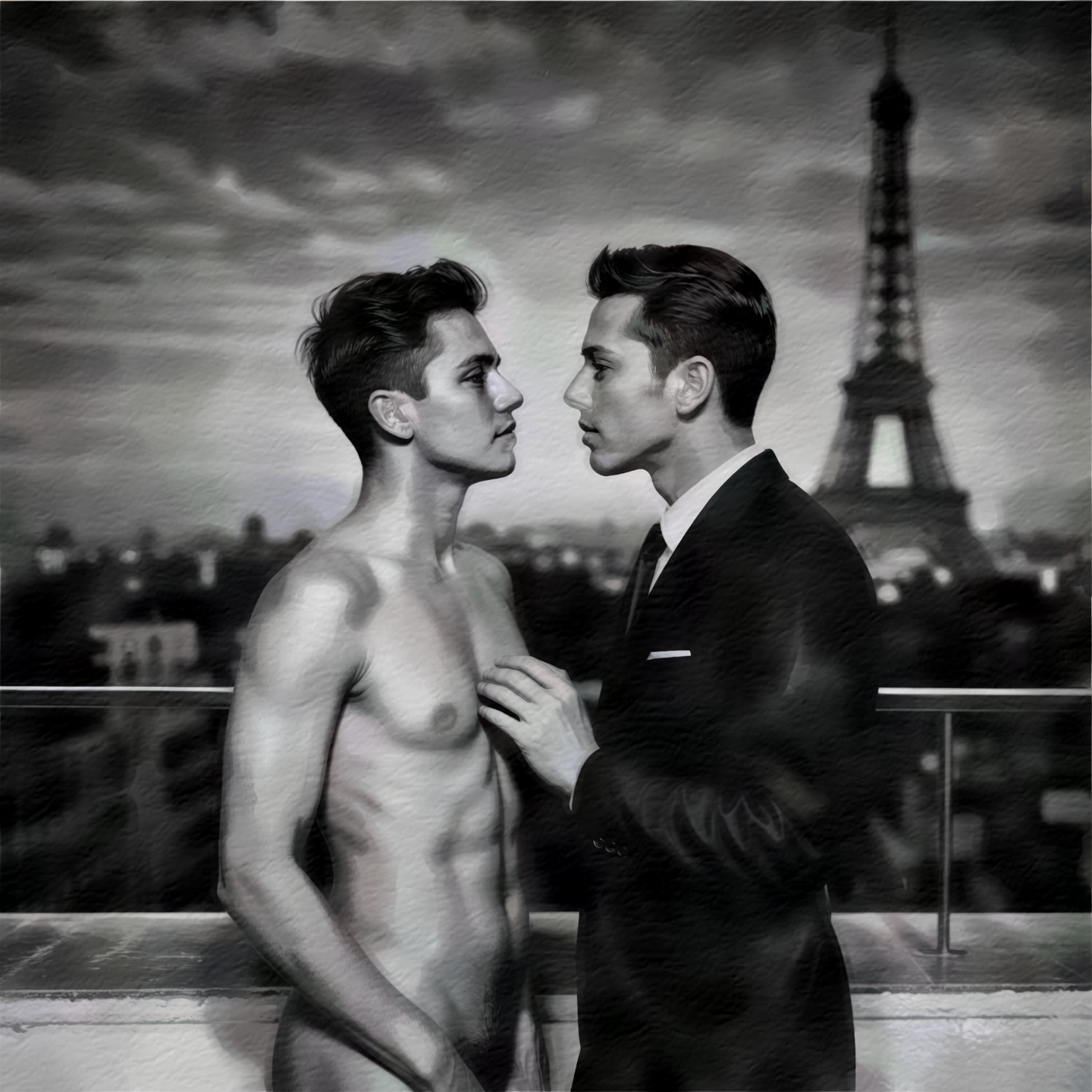 Der Himmel dramatisch, die Stadt zu ihren Füßen, der Eiffelturm ragt in die Wolken. Zwei Männer auf einer Dachterrasse – ein Moment zwischen Himmel und Erde. Schwarzweiss übermalt als Aquarell. Die Technik verwandelt die Szene: Der dramatische Himmel wird weich, die Konturen der Stadt verschwimmen, die Realität wird zum Traum.
