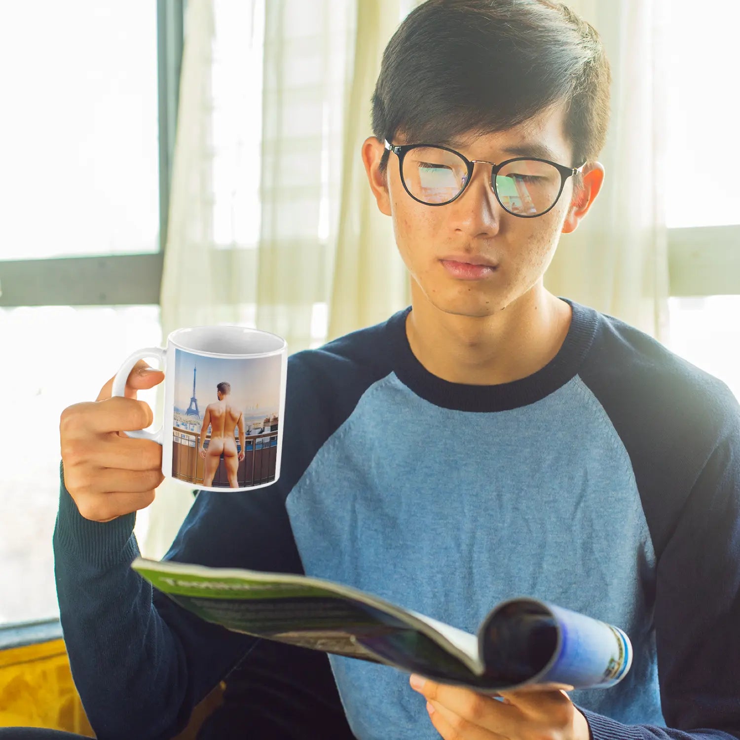 Diese Kunst-Tasse zeigt einen jungen Mann mit athletischer Figur, der im Morgenlicht auf einem Balkon steht. Nackt, frei, selbstbewusst. Sein durchtrainierter Körper – als käme er gerade aus dem Studio – hebt sich gegen den Pariser Himmel ab. Vor ihm der Eiffelturm, unter ihm die Dächer der Stadt. Es ist ein Moment purer Freiheit und Selbstbewusstsein – keine Kleider, keine Masken, nur er selbst und die schönste Stadt der Welt.