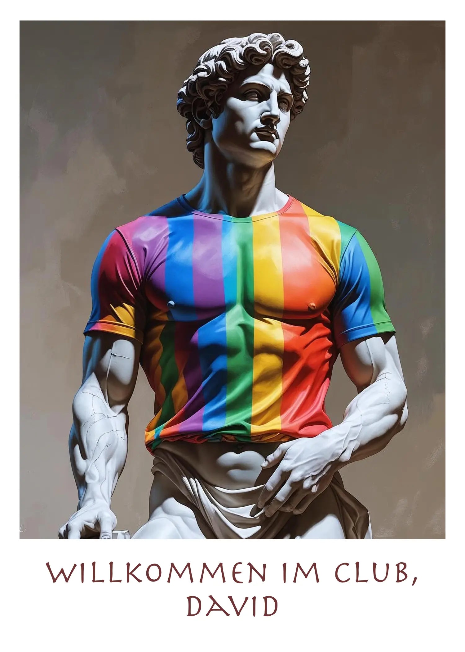 Diese künstlerische Darstellung verbindet die zeitlose Schönheit der klassischen David-Statue mit dem kraftvollen Symbol des Rainbow-Pride-Shirts. Die weiße Marmor-Ästhetik verschmilzt mit leuchtenden Regenbogenfarben in Lila, Blau, Türkis, Grün, Gelb, Orange, Rot und Pink – eine selbstbewusste Aussage über queere Identität und moderne Gay Art.