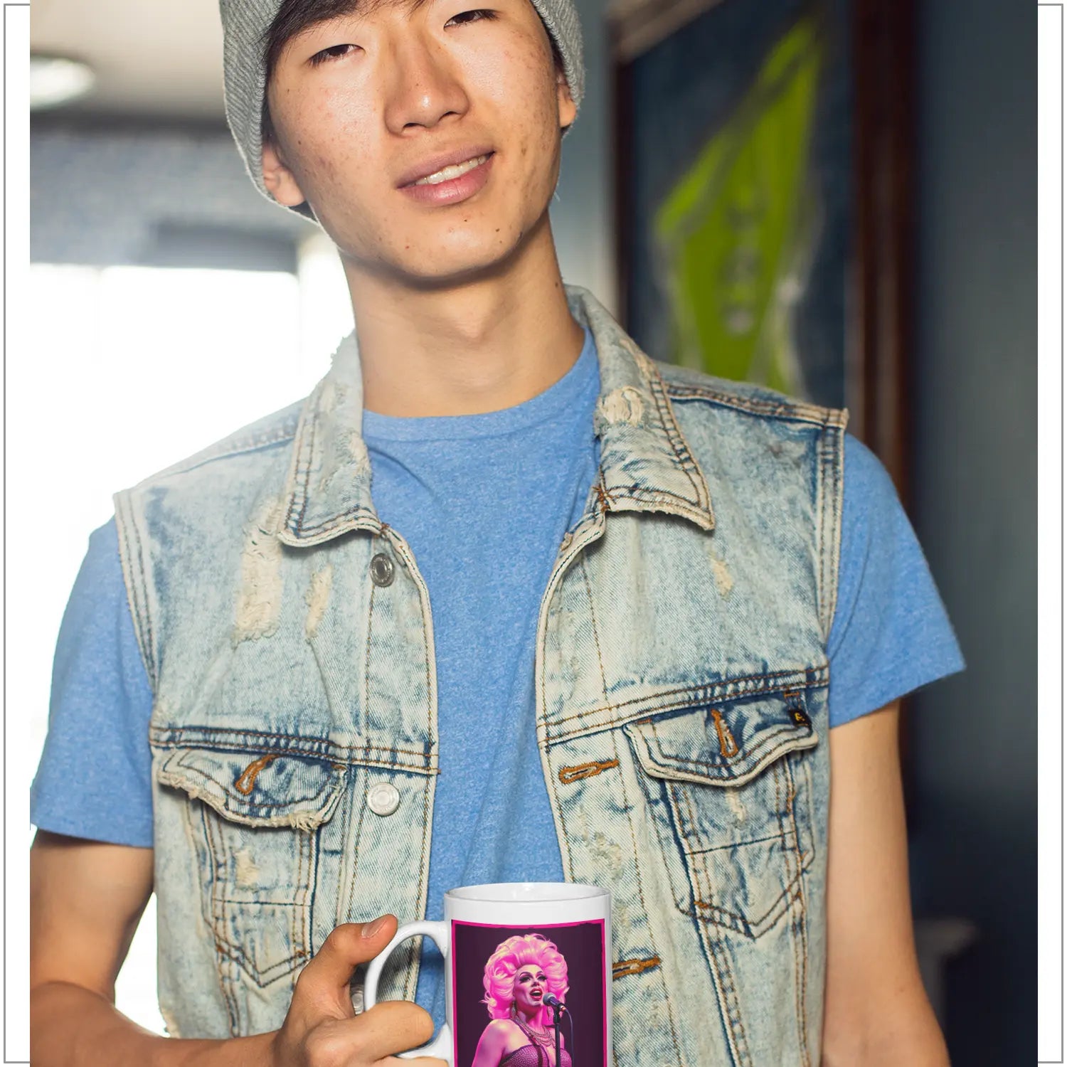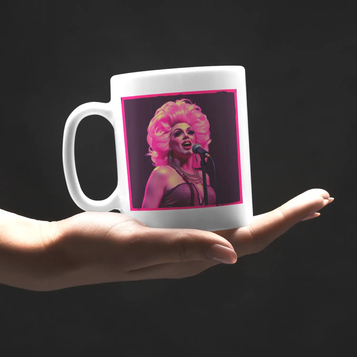 This art mug celebrates the art of drag: A queen in full glamour, blonde curls like Marilyn, sparkling bustier, pearl necklace – and the microphone firmly in hand. She sings, she performs, she is pure joy of life. This is more than just a mug – it is a tribute to all who have the courage to be themselves and shine while doing so.