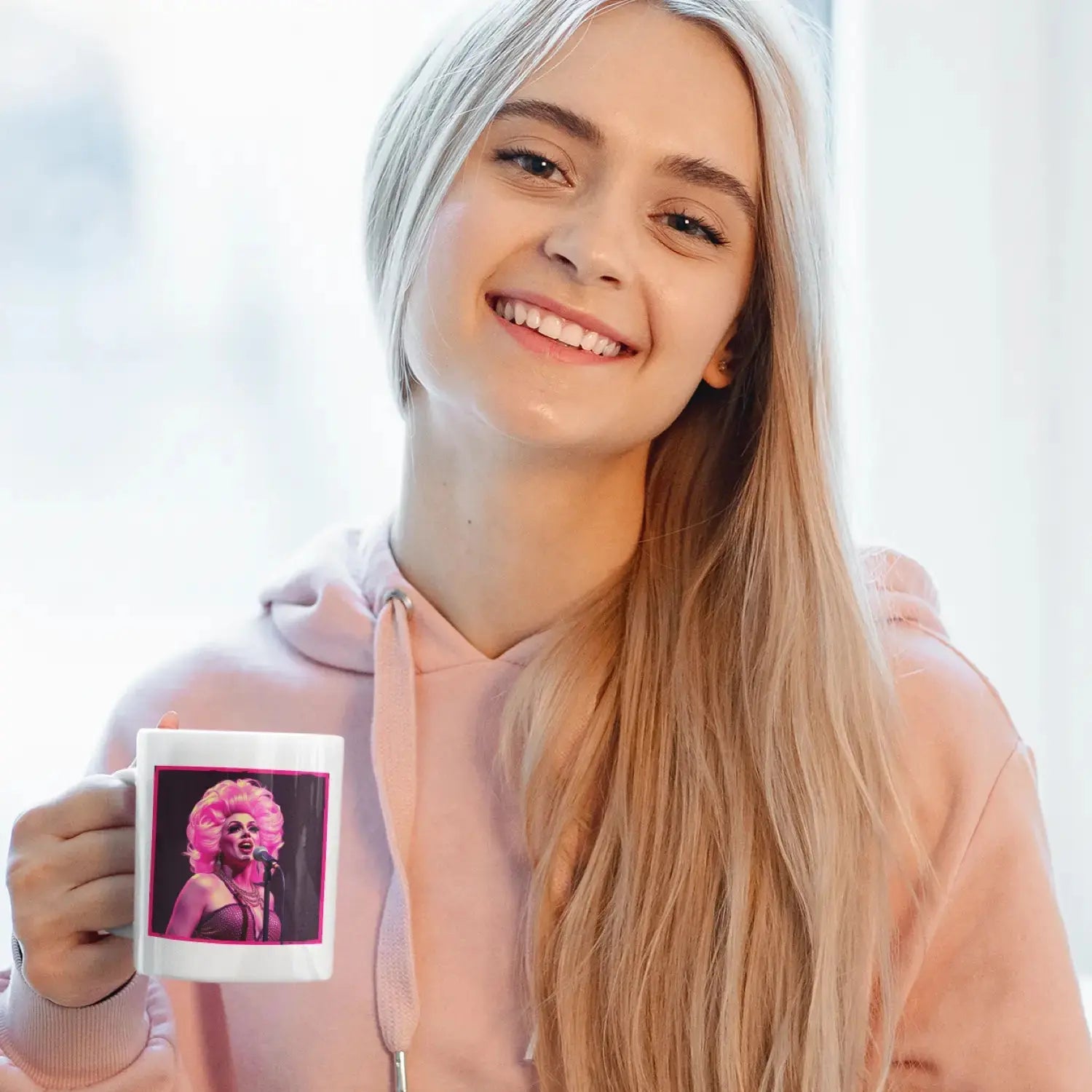 - Design: Drag queen performance in full glamour – blonde wig, sparkling outfit, microphone