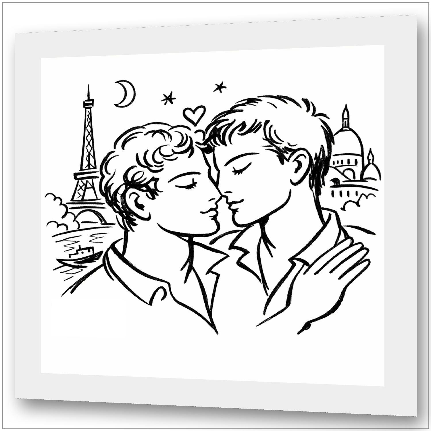 Sotto il cielo notturno di Parigi, due uomini si baciano – la Torre Eiffel e il Sacro Cuore sullo sfondo, la luna e le stelle sopra di loro. Questo quadro murale è ispirato alla linea chiara di Jean Cocteau e al suo modo di rappresentare l’amore tra uomini: tenero, visibile, senza compromessi.