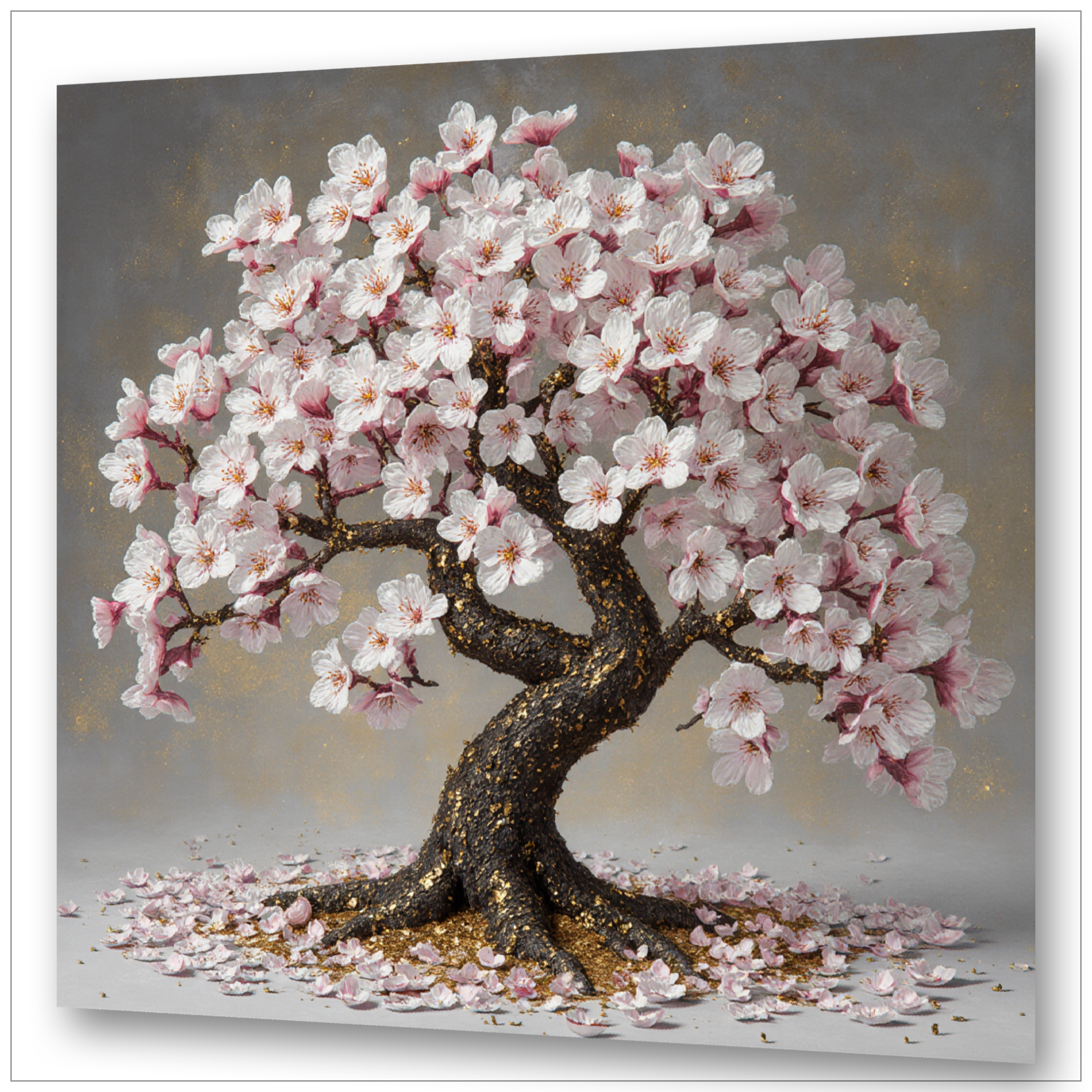 A árvore está forte e elegante, as flores brilham em rosa suave e branco, os acentos dourados no tronco conferem profundidade e calor à imagem. As pétalas caídas contam a transitoriedade do momento – e é precisamente por isso que o tornam tão precioso.