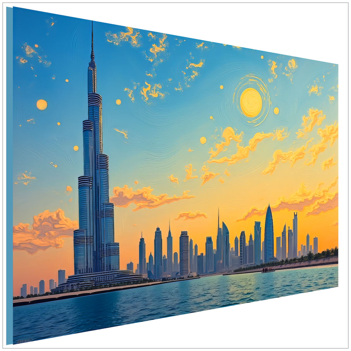 Himlen rör sig i van Goghs drag, de gyllene molnen lyser varmt, vattnet speglar mjukt. Skylinen med Burj Khalifa står lugnt och kraftfullt – ett ögonblick mellan dag och kväll, fångat i van Goghs stil.